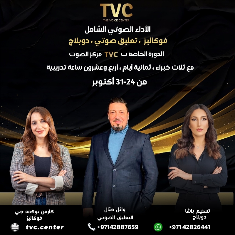 دورة مميزة وخاصة ب TVC مع نجوم مهن الصوت كارمن توكمه جي وائل حبّال وتسنيم باشا وتدريب أكاديمي مهني في الڤوكاليز والتعليق الصوتي والدوبلاج O٨ أيام ٢٤ ساعة تدريبية عملية متكاملة وممتعة